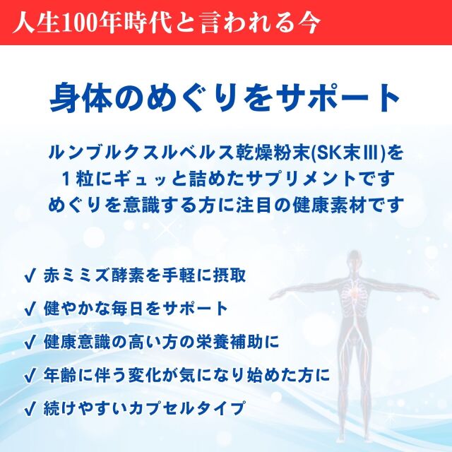 ミミズは地球上に、あらゆる天変地異を乗り越え4億年前から存在しています。地中にはバクテリア等が多く生存し有機物等を分解、ミミズはその分解された有機物の餌と一緒にバクテリアを食べ、自身の体内環境が良くなり、あらゆる環境へ適応するための酵素を体内に保有していました。SKMAXはルンブルクスルベルスという種類の赤ミミズを乾燥粉末化したSK末Ⅲを1粒に200mg配合した新たな可能性が期待出来る赤ミミズ酵素サプリメントです。