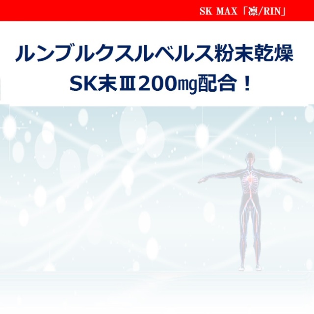凜 SKMAXは、ルンブルクスルベルスという種類の赤ミミズを乾燥粉末化したSK末Ⅲを200mg配合されたカプセルサプリメントです。おやすみ前に、一日一粒を目安に、お水と一緒にお飲みください。